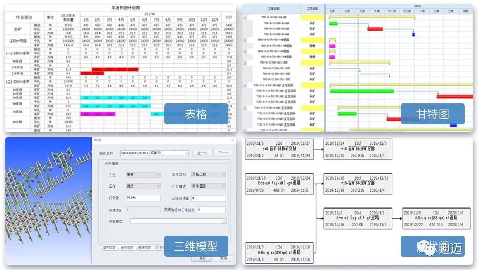2、研發“三維模型-甘特圖-網絡圖-數據表”四位聯動的地下礦采掘計劃編制系統,實現排產參數批處理、計劃聯動編制和分期采掘圖、自定義報表、進度動畫及三維模型等多種計劃成果展現驗證形式。