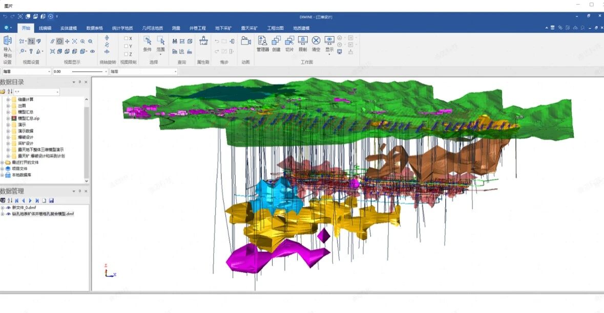 圖1-利用DIMINE構建包含地形、礦體、邊坡等要素的三維實體模型